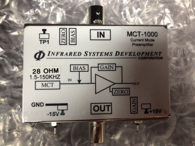 MCT-1000 前置放大器提供的SMA-BNC电缆连接到输入BNC连接器。需要正负15伏直流电源,输出至少200毫安(100毫安为-15伏)。探测器的偏置由内部提供,偏置电压(或电流)通常可从0V调整到+2.5伏。标准的前放带宽内部设置为1.5Hz至200Khz;其他带宽(高达5Mhz)也可选。